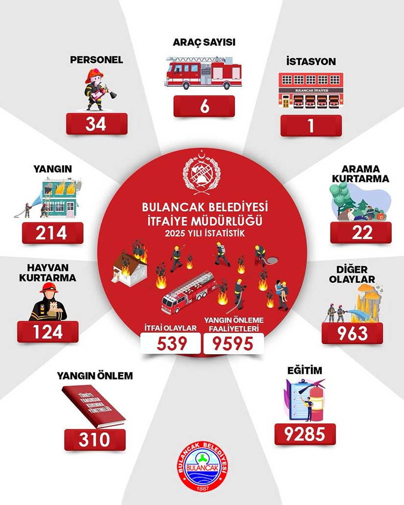 34 personel, 6 araç ve 1 istasyonla hizmet veren Bulancak İtfaiyesi, yıl boyunca toplam 539 itfai olaya müdahale etti. Bunun yanı sıra yangın önleme ve eğitim çalışmalarıyla 18 bini aşkın vatandaşa ulaşılarak farkındalık oluşturuldu.