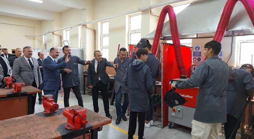 Vali Serdengeçti, Makina ve Tasarım Teknolojisi Atölyesi’ni ziyaret ederek öğrencilerin mesleki ve üretim çalışmalarını inceledi. Vali Serdengeçti, öğrencilere yönelik projeler ve atölye çalışmaları hakkında hem yetkililerden hem de öğrencilerden bilgi aldı.