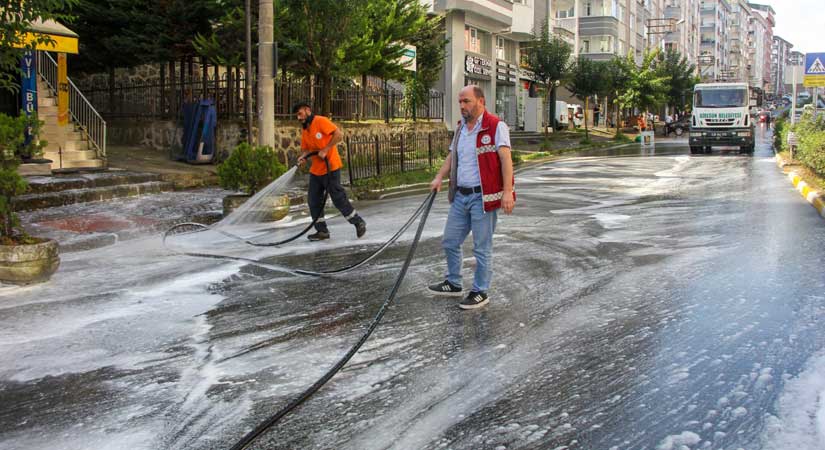 Temizlik İşleri Müdürlüğü tarafından devam eden çalışmada cadde, sokak, kaldırımlar tazyikli ve köpüklü su ile yıkanıyor.