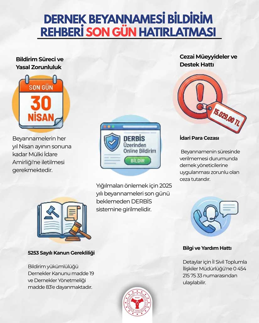 Açıklamada, beyannamesini süresi içinde bildirmeyen dernek yöneticilerine 2026 yılı itibarıyla 15 bin 29 lira idari para cezası uygulanmasının yasal bir zorunluluk olduğu hatırlatıldı. Derneklerin herhangi bir cezai yaptırımla karşılaşmamaları için süreci dikkatle takip etmeleri istendi.