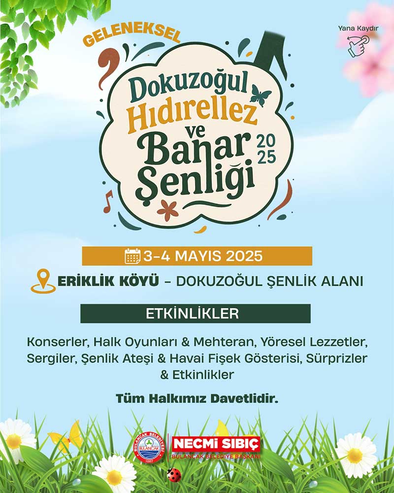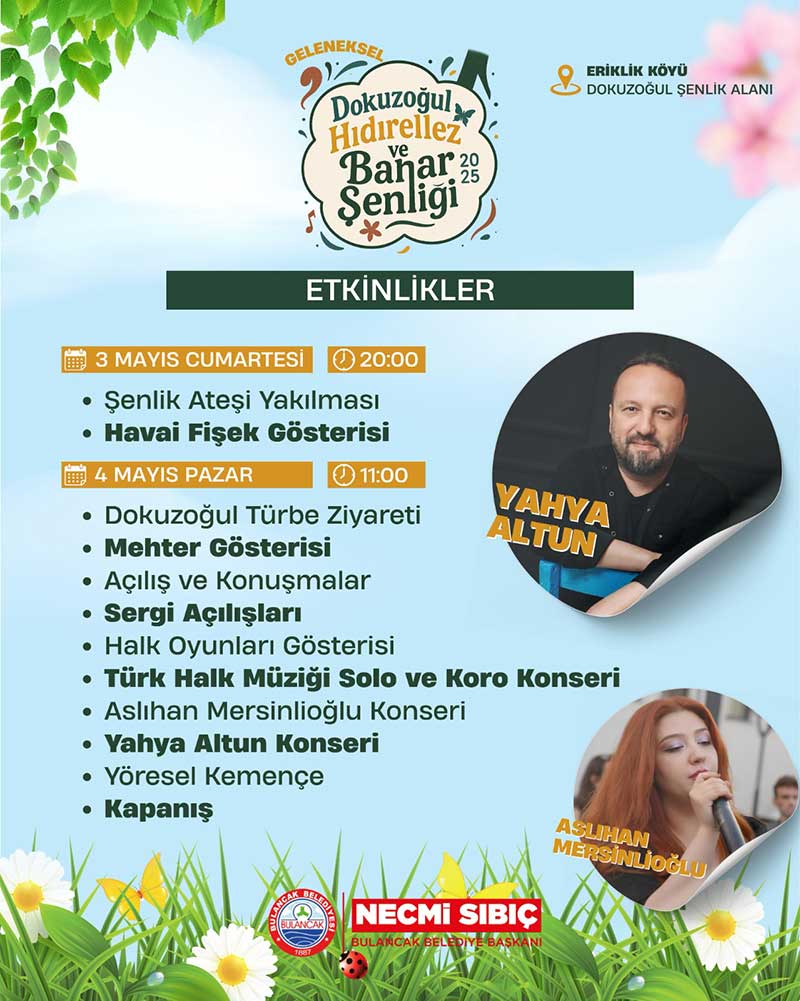 Bulancak Eriklik köyünün geleneksel “Dokuzoğul Hıdırellez ve Bahar Şenliği” bu yıl da coşkulu etkinliklerle kutlanacak. 3-4 Mayıs Cumartesi ve Pazar günleri Dokuzoğul Şenlik alanında gerçekleştirilecek olan kutlamalar, Bulancak Kaymakamlığı, Bulancak Belediyesi ve Eriklik Köyü Muhtarlığı iş birliğiyle düzenleniyor.