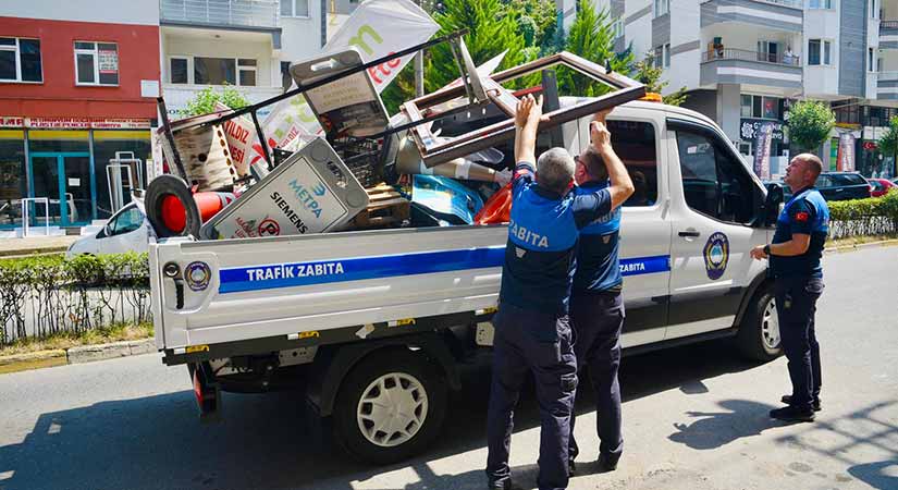 İnönü ve Orhan Yılmaz Caddesi’nde gerçekleştirilen son uygulamada, esnafların dükkan önlerine koyduğu dubalar, levhalar, yelken bayraklar ve çeşitli eşyalar zabıta ekipleri tarafından toplandı.
