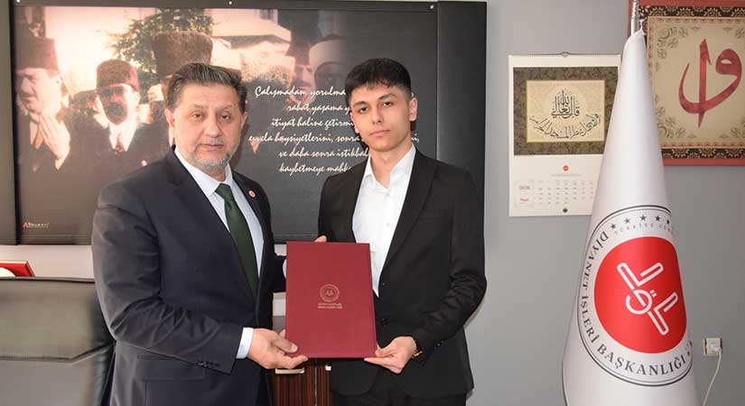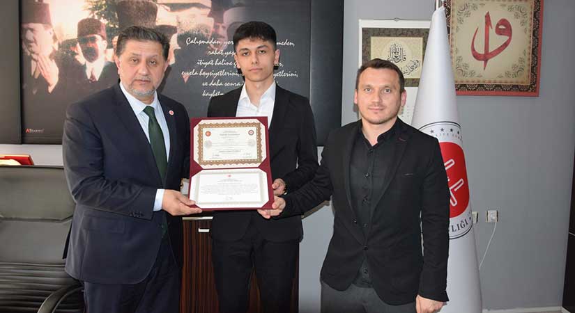 Müftülük makamında gerçekleştirilen törende İlçe Müftüsü Haki Özgül, hafız öğrenci Ahmet Samet Durmuş’a belgesini takdim etti. Tören, samimi bir atmosferde gerçekleşti.