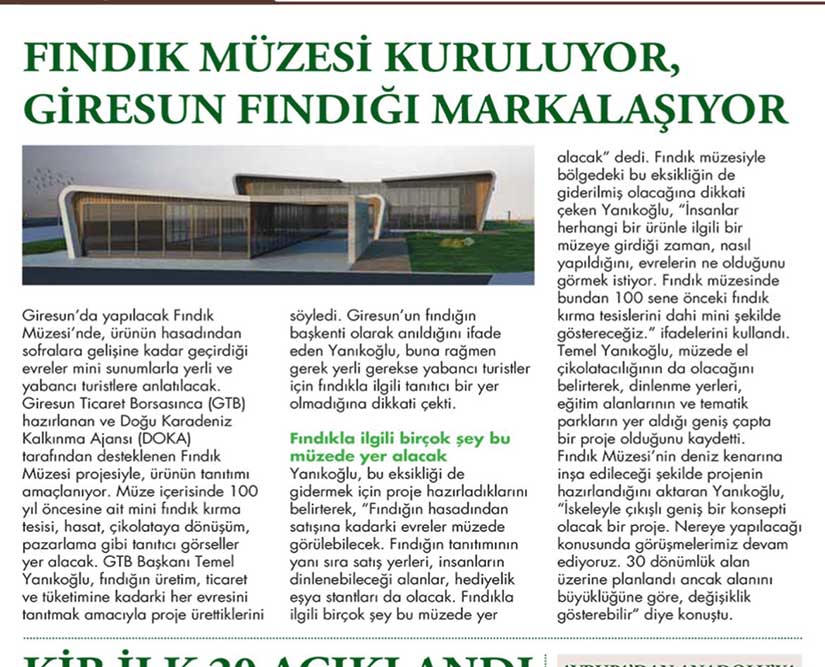 Ocak 2017 tarihinde Giresun Ticaret Borsası tarafından yayımlanan dergide, “Fındık Müzesi kuruluyor, Giresun fındığı markalaşıyor” başlığıyla dikkat çekici bir proje kamuoyuna ilan edildi. Haberde yer alan bilgilere göre, Giresun’da yapılması planlanan Fındık Müzesi’nde ürünün hasattan sofraya kadar geçtiği tüm evrelerin mini sunumlarla yerli ve yabancı turistlere anlatılması hedefleniyordu.