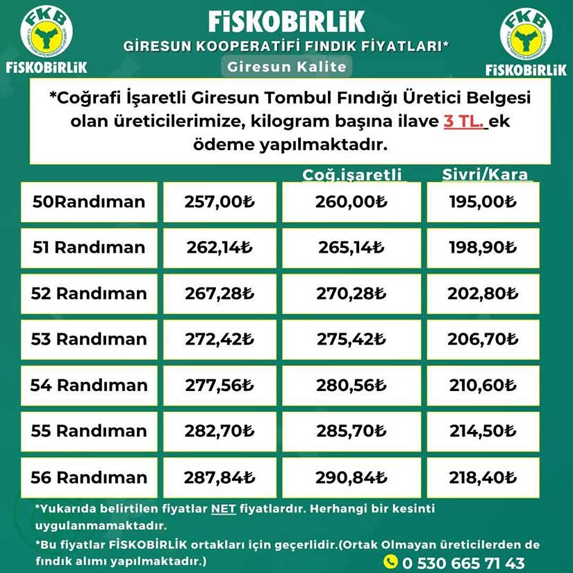 FİSKOBİRLİK tarafından açıklanan Giresun kalite fındık fiyatları üreticilerle paylaşıldı. Yeni fiyat listesine göre 50 randıman fındık 257 TL’den başlarken, 56 randımana kadar fiyatlar kademeli olarak yükseliyor.