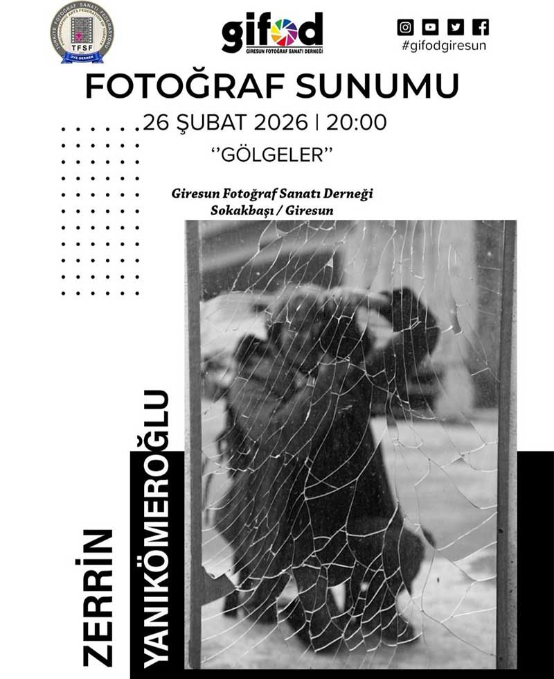 Giresun Fotoğraf Sanatı Derneği üyesi Zerrin Yanıkömeroğlu’nun hazırladığı “Gölgeler” başlıklı fotoğraf sunumu, 26 Şubat 2026 Perşembe günü saat 20.00’de gerçekleştirilecek. Etkinlik, Sokakbaşı’nda bulunan GİFOD Kültür ve Sanat Merkezi’nde yapılacak.