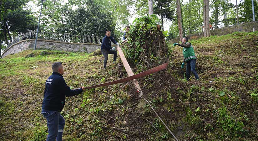 Belediye Park ve Bahçeler Müdürlüğü ekipleri tarafından yürütülen çalışmada, görüntü kirliliğine yol açan ağaç kökleri iş makineleri ve vinç yardımıyla yerlerinden sökülerek alandan uzaklaştırıldı. Yapılan açıklamada, ağaç köklerinin kuruma veya devrilme gibi nedenlerle kesildiği, ancak zamanla görsel olarak çevre düzenlemesini olumsuz etkilediği belirtildi.
