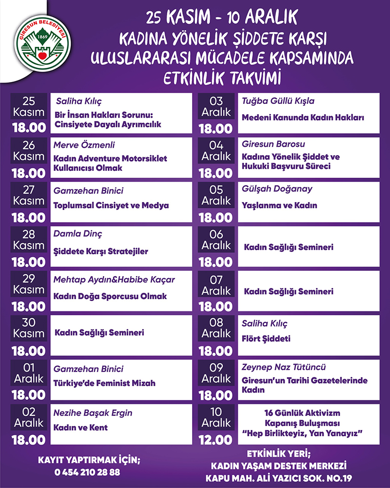 Giresun Belediyesi, hazırlanan etkinlik takvimiyle kadına yönelik şiddetle mücadelenin yalnızca kadınların değil, toplumun bütününün görevi olduğuna dikkat çekti. Farkındalığın artırılması, şiddetin önlenmesi ve insan haklarının korunması amacıyla herkesin sürece katılması çağrısı yapıldı.