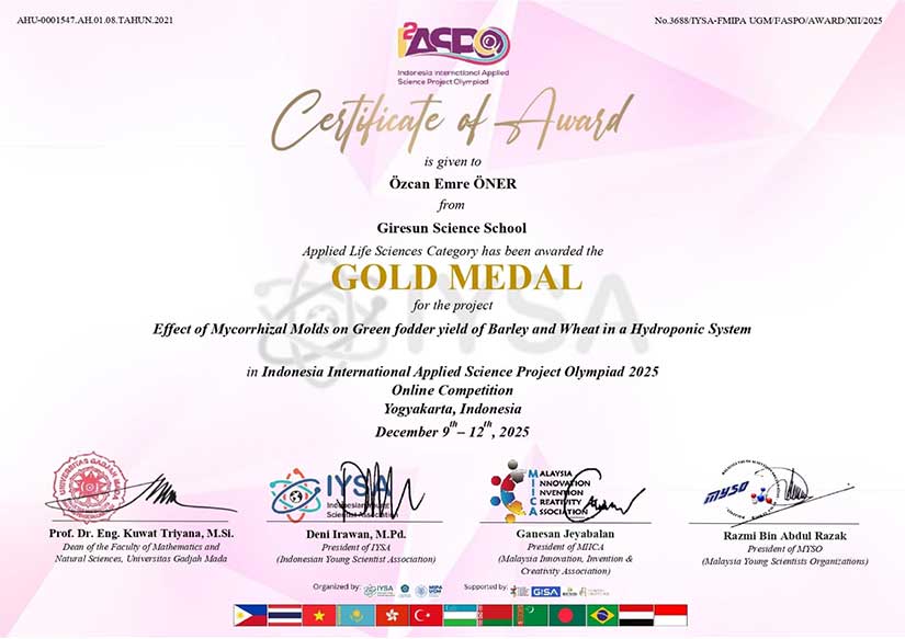 9–12 Aralık 2025 tarihleri arasında çevrim içi olarak düzenlenen Indonesia International Applied Science Project Olympiad (I2ASPO) yarışmasına katılan Giresun Fen Lisesi öğrencileri Beyza Çakır ve Özcan Emre Öner, Life Science (Yaşam Bilimleri) kategorisinde yarıştı. Öğrenciler, hazırladıkları projeyle jüri üyelerinden tam not alarak altın madalya kazandı.