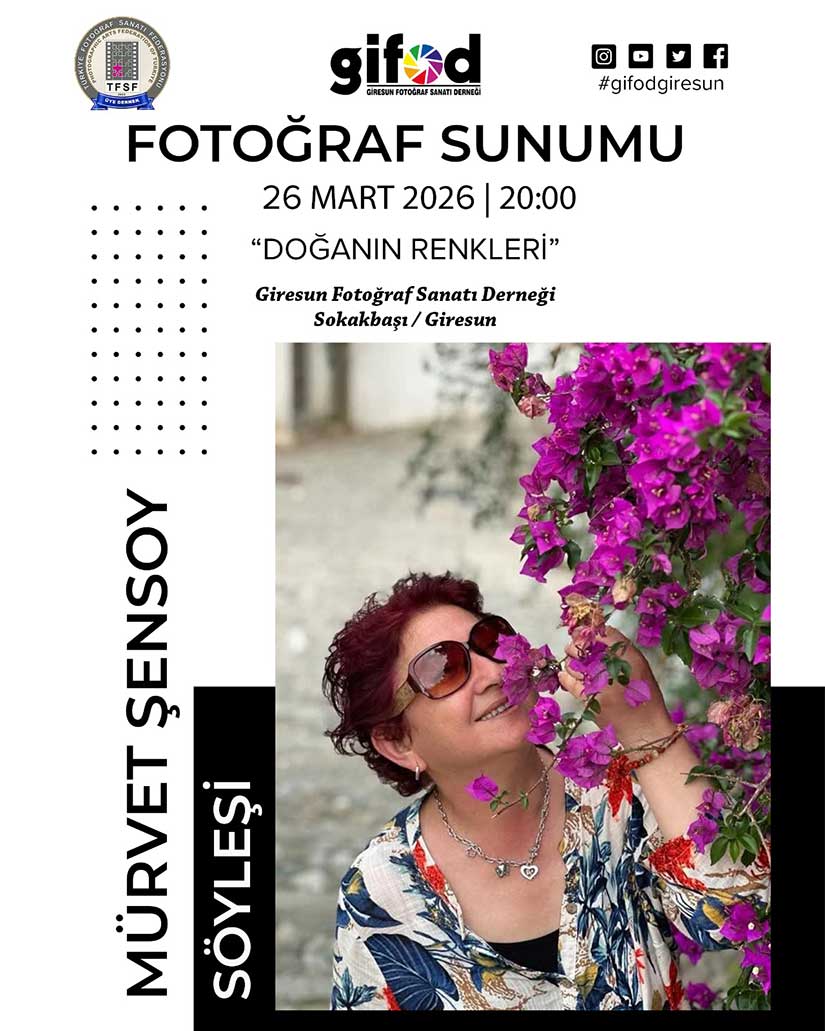 Giresun Fotoğraf Sanatı Derneği (GİFOD) tarafından organize edilen etkinlikte, fotoğraf sanatçısı Mürvet Şensoy doğanın büyüleyici renklerini ve ışıkla kurduğu ilişkiyi izleyicilerle paylaşacak. “Doğanın Renkleri” isimli sunumda, doğanın farklı mevsimlerde sunduğu görsel zenginlikler fotoğraf kareleri üzerinden anlatılacak.