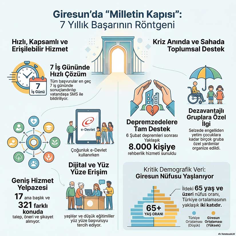 Giresun Valiliği Açık Kapı Şube Müdürlüğü tarafından hazırlanan rapor, kentin sosyo-ekonomik yapısına dair önemli veriler sunarken, vatandaşların talep ve sorunlarına yönelik geliştirilen hızlı çözüm mekanizmalarını da ortaya koydu. Yedi yıllık süreci kapsayan çalışma, kamu hizmetlerinde erişilebilirlik ve şeffaflık açısından dikkat çekici sonuçlar içeriyor.