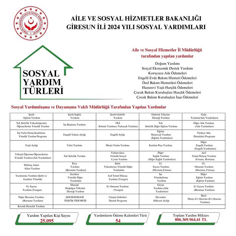 Aile ve Sosyal Hizmetler Bakanlığı tarafından Giresun’da ihtiyaç sahibi vatandaşlara yönelik yapılan sosyal yardım çalışmaları kapsamında, 2024 yılı boyunca toplam 54 farklı kalemde yardım ödemesi gerçekleştirildi.