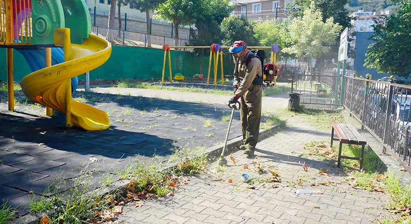 Belediye Park ve Bahçeler Müdürlüğü ekipleri, çocuk oyun alanları, mesire yerleri ve kaldırımlardaki yabani otları biçerek çim alanları düzenli hale getiriyor. Ayrıca yol kenarlarında ve kaldırımlarda biriken otlar ile dökülen yapraklar da toplanıyor.