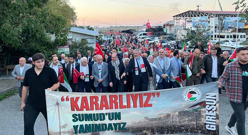 Konuşmaların ardından tekneler ve balıkçı kayıkları denizden, vatandaşlar ise karadan Hükümet Konağı’na kadar yürüdü. Giresunlular, yürüyüş boyunca Filistin halkına destek sloganları attı ve dualarla dayanışma çağrısında bulundu.