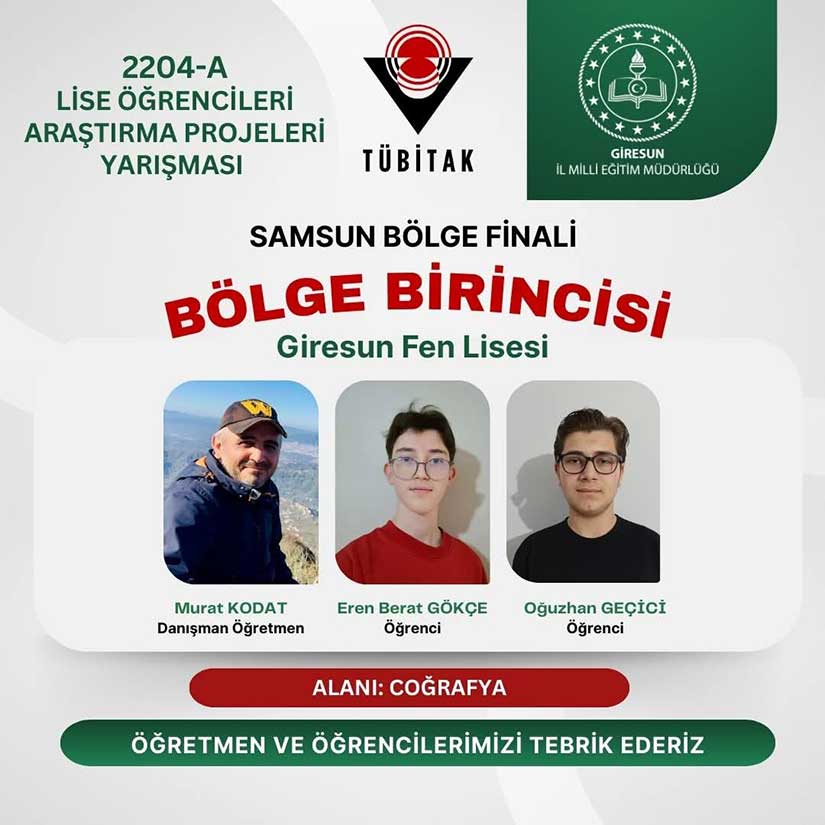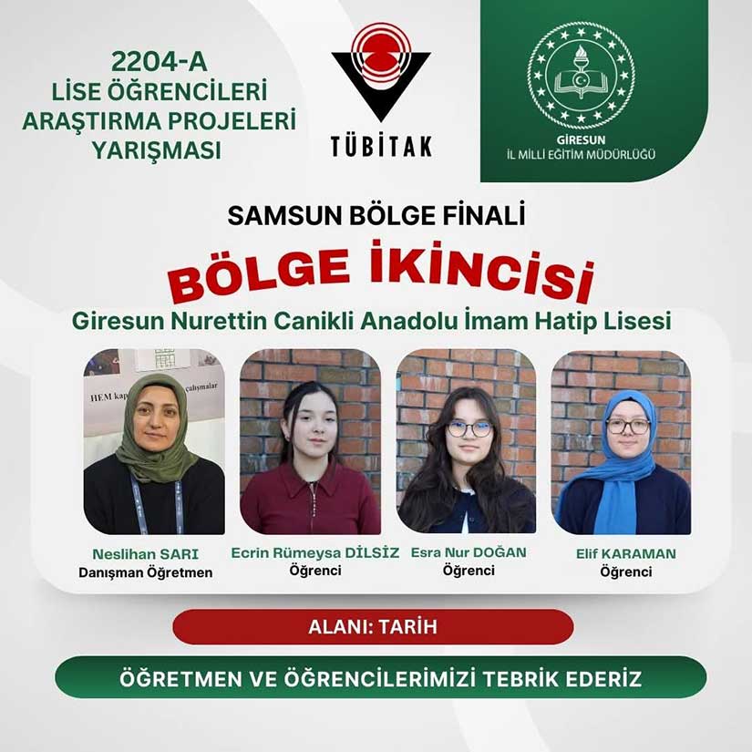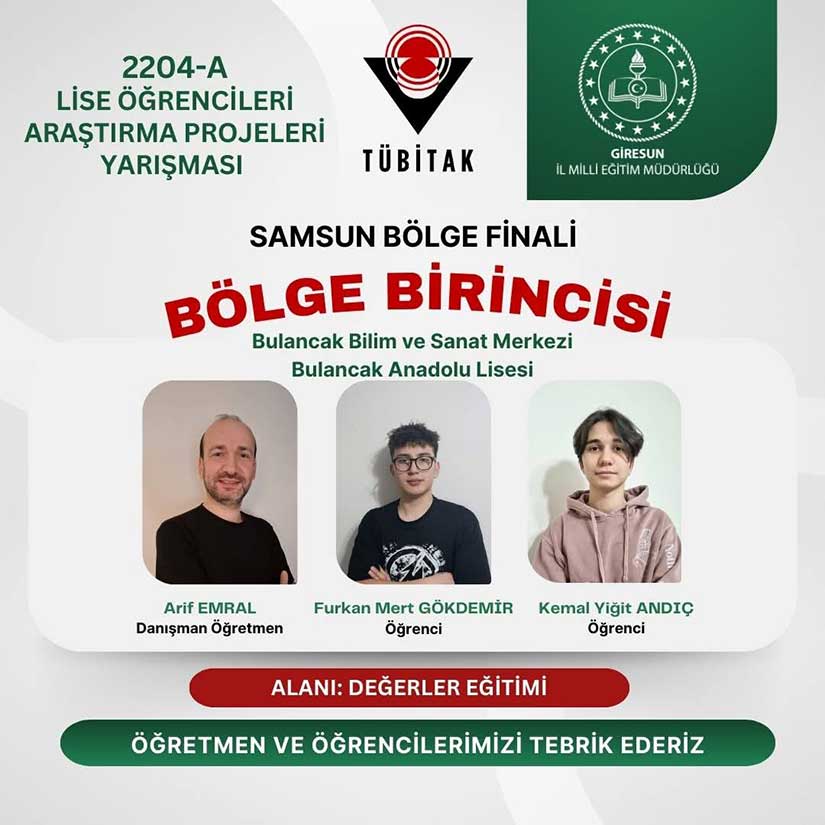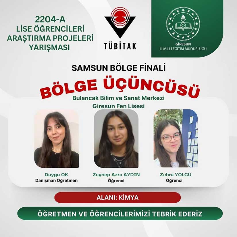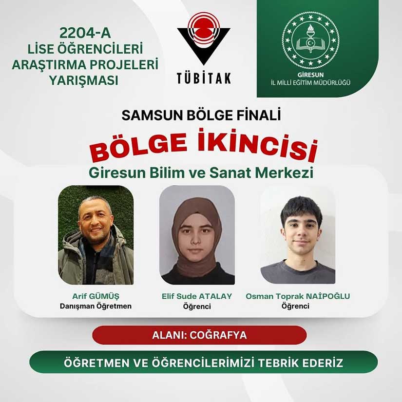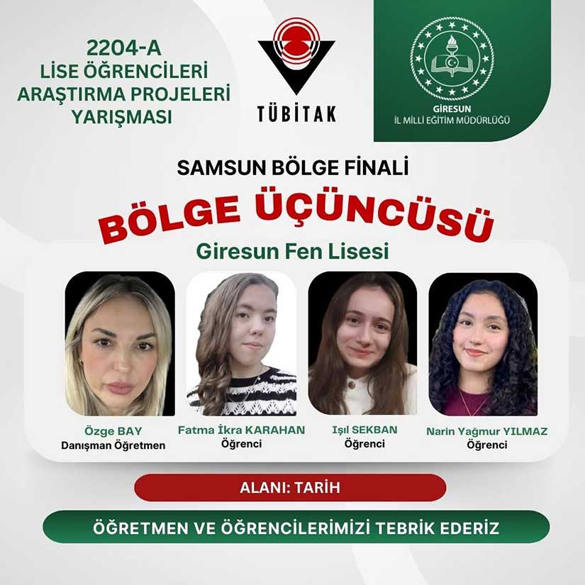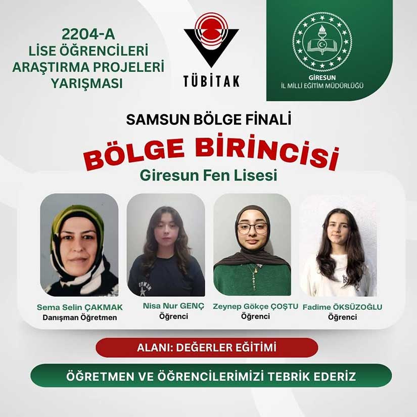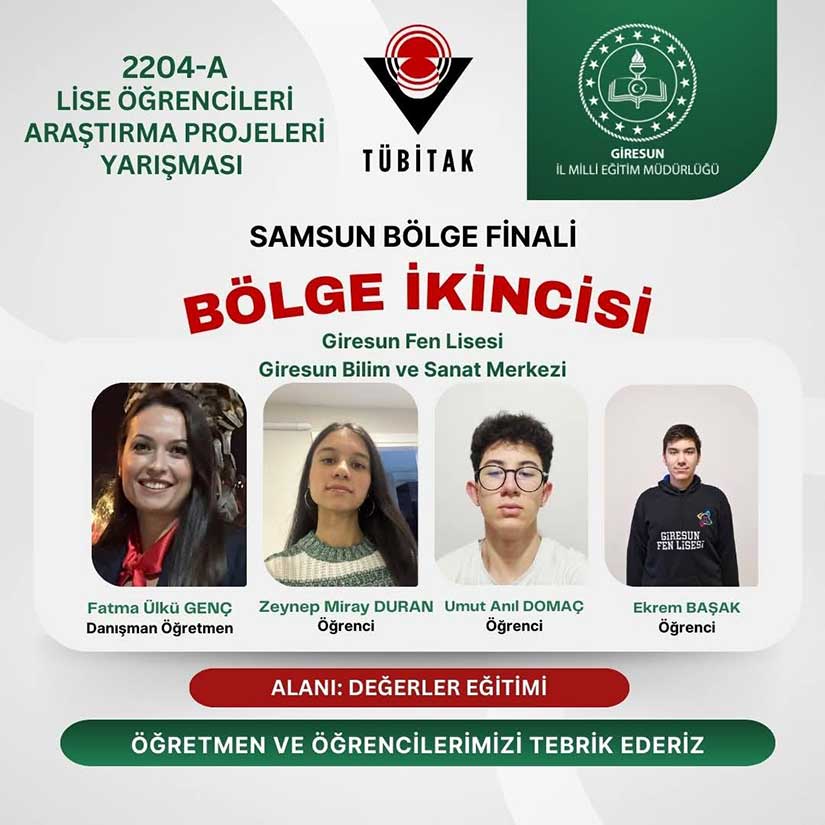 TÜBİTAK 2204-A Lise Öğrencileri Araştırma Projeleri Yarışması’nın Samsun Bölge Finali’nde Giresunlu öğrenciler ilimizi başarıyla temsil etti. Giresun İl Milli Eğitim Müdürlüğü, öğrenci ve öğretmenleri tebrik etti.