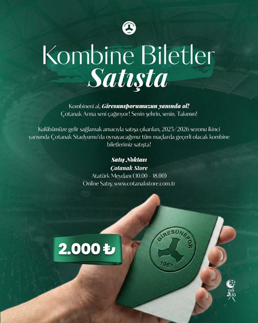 Giresunspor, 2025/2026 sezonunun ikinci yarısında sahasında oynayacağı karşılaşmalar için kombine biletleri satışa sundu. Kulüp, “Senin şehrin, senin takımın” sloganıyla taraftarlarını Çotanak Stadyumu’nda takımlarının yanında olmaya davet etti.