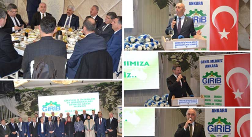 Giresun İş İnsanları ve Bürokratları Derneği (GİRİB), Ankara Yenimahalle Ankara Evi’nde düzenlediği iftar yemeğinde Giresunlu iş insanlarını, bürokratları ve siyasetçileri buluşturdu. Programa Ankara’da yaşayan Giresunluların yanı sıra milletvekilleri, yargı mensupları, STK temsilcileri ve iş dünyasından isimler katıldı.