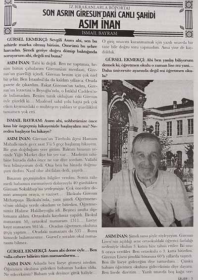 Giresun Can Akengin Bilgi Yurdu Derneği tarafından aylık olarak yayımlanan ve seçkin kadrosuyla her sayısında dikkat çeken İzler Dergisi, Ağustos sayısında Gazeteci/Yazar Asım İnan ile özel bir röportaja yer verdi.