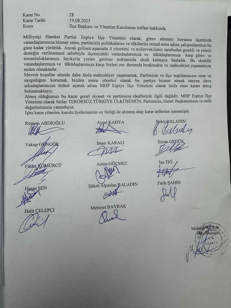 Kurt, destek eksikliği nedeniyle hem vatandaşlar hem de ülküdaşlar karşısında mahcubiyet yaşadıklarını belirtti. Bu durumun ilçe teşkilatını zor durumda bıraktığını ifade eden Kurt, partinin onur ve saygınlığını korumak adına toplu istifa kararı aldıklarını açıkladı.