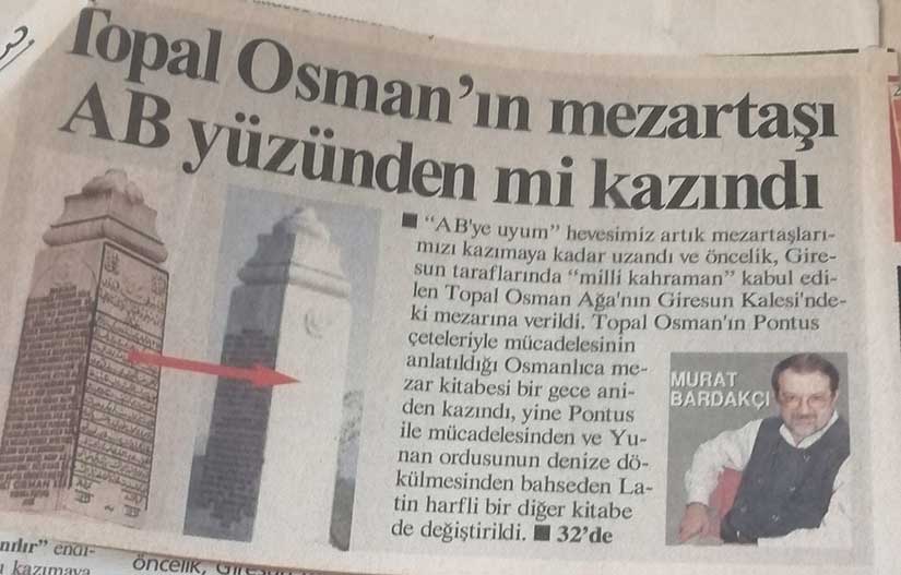 Ne garip ki. Giresun tarihine yapılan bu tecavüzü kimse üstüne almadı!.. Anıt mezardaki kitabe AB uyum yasaları gerekçe gösterilerek kazınmıştı. Sonrasında dönemin TTK başkanı Prof. Dr. Yusuf Halaçoğlu’nun raporu ile metnin ve çevrim yazısı uzun bir uğraştan sonra yeniden hakk edildi.