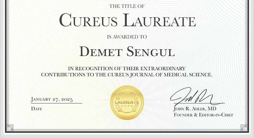Rektörlükten yapılan açıklamada, Web of Science Core Collection ve Institute for Scientific Information dizinlerinde taranan Cureus dergisi tarafından Prof. Dr. Demet Şengül’e “Lifetime Award – Laureate Status” unvanı verildiği ve bu kapsamda sertifika almaya hak kazandığı belirtildi.