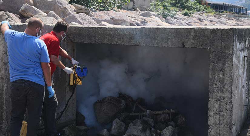 Bu kapsamda, Belediye Veteriner İşleri Müdürlüğü tarafından şehrin tüm mahallelerinde sürdürülen ilaçlama çalışmalarının ardından, farklı bir uygulama daha gerçekleştirilerek sahil bölgesinde bulunan kayalıklarda, menfezlerde ve dere yataklarında ilaçlama çalışması yapıldı.