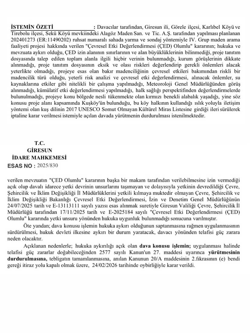 Yapılan açıklamalarda, yürütmeyi durdurma kararının bağlayıcı olduğu ve bu karara rağmen sahada çalışma yapılmak istenmesinin hukuka aykırılık oluşturduğu vurgulandı.