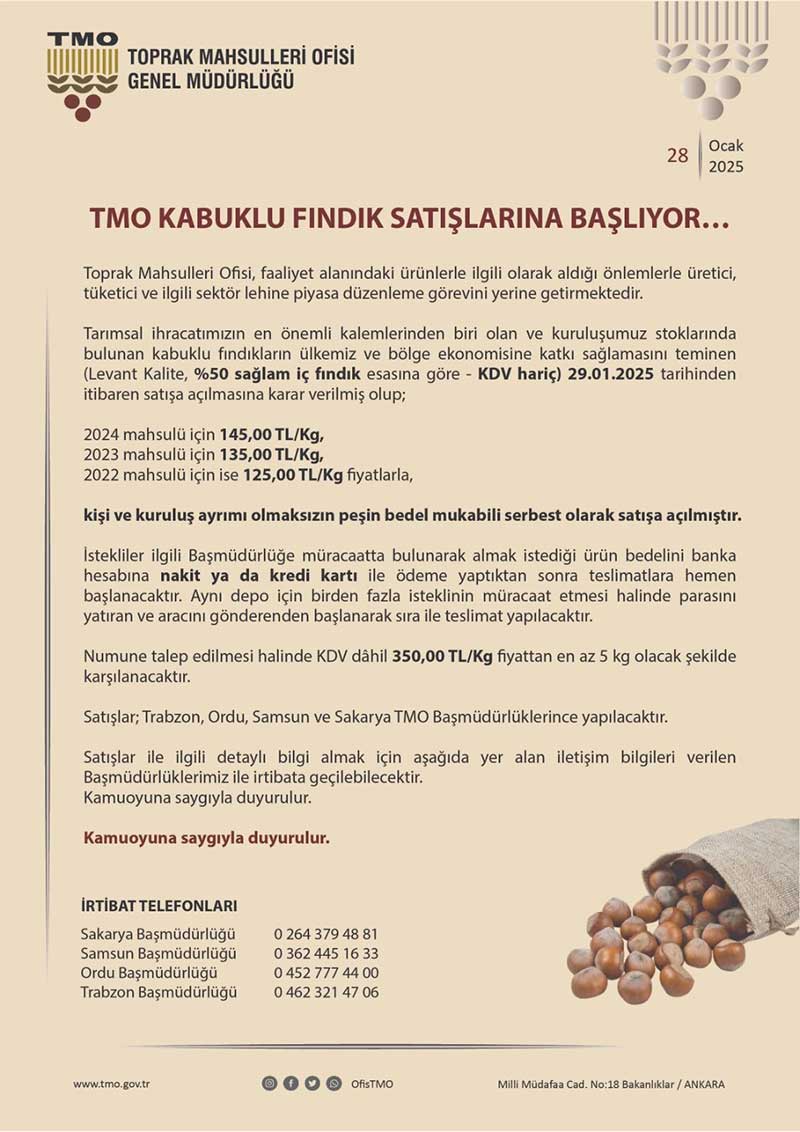 Satışlarla ilgili detaylı bilgi almak isteyenler, Trabzon, Ordu, Samsun ve Sakarya TMO Başmüdürlükleri ile iletişime geçebilecek.