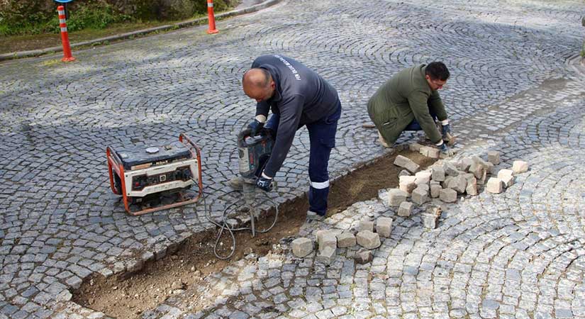 Fen İşleri Müdürlüğü ekipleri tarafından Kale’de küp taş tamiratı gerçekleştirilirken, Gemilerçekeği Mahallesi’nde merdiven yapımı çalışmaları devam ediyor. Gedikkaya Mahallesi’nde cami çevresinde düzenleme yapılırken, Aksu Mahallesi Caner Sokak ve 38 Nolu Sokak’ta kaldırım tamiratı sürdürülüyor.