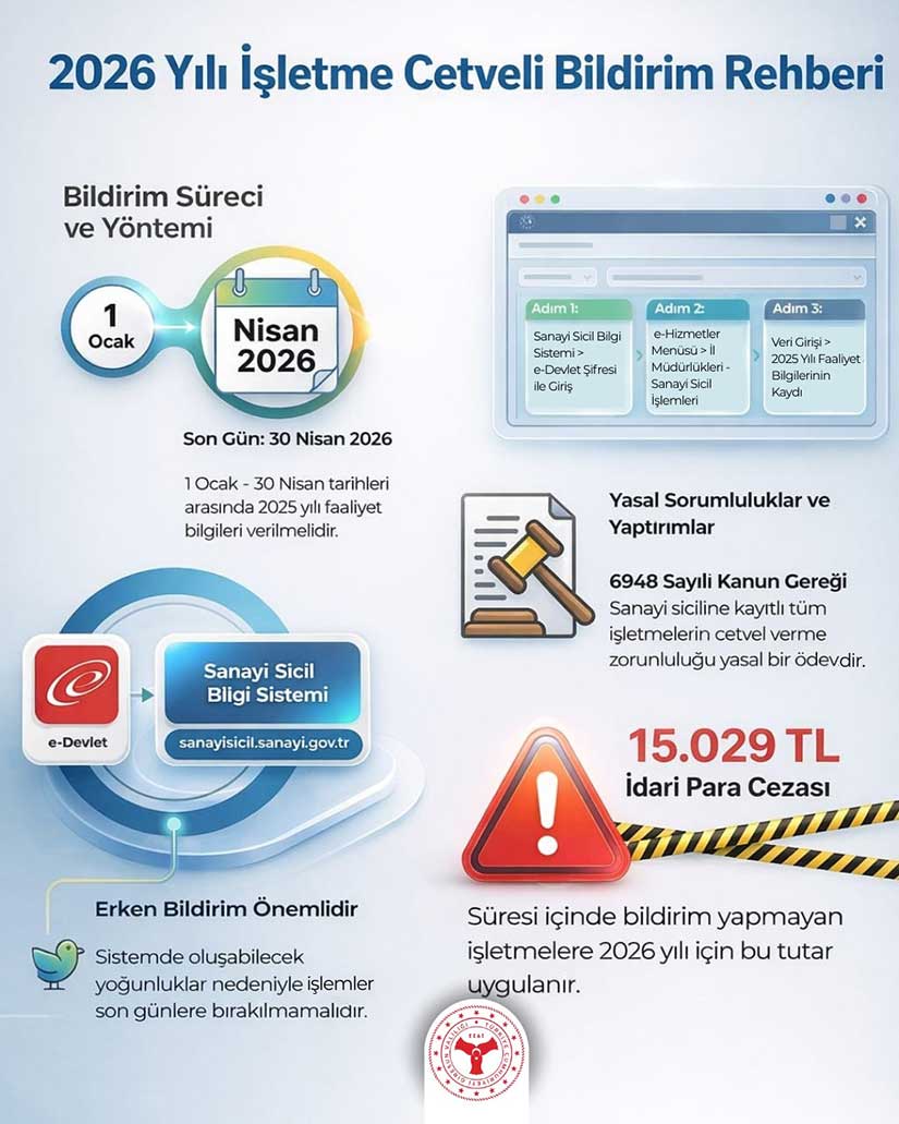 6948 sayılı Sanayi Sicil Kanunu gereğince her yıl verilmesi zorunlu olan Yıllık İşletme Cetvellerinin, Sanayi Sicil Bilgi Sistemi üzerinden elektronik ortamda iletilmesi gerekiyor. İşletme yetkilileri, e-Devlet kapısı ya da Sanayi ve Teknoloji Bakanlığının resmi internet sitesinde yer alan “Sanayi Sicil İşlemleri” bölümü üzerinden bildirimlerini gerçekleştirebiliyor.